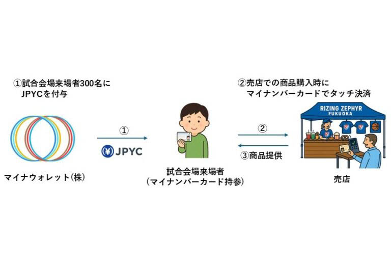 実証実験の第1弾は、2026年1月23日から福岡市のプロバスケットボールチーム「ライジングゼファーフクオカ」の試合会場で実施されます。来場者はマイナンバーカードを使って登録すると、1,000円分の日本円建てステーブルコイン「JPYC」が付与され、会場の売店で実際に買い物を体験できるというものです。